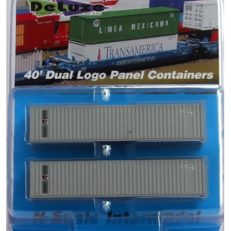 This is a Deluxe Innovations 238-5121 N Scale 40′ Corrugated Dual-Logo Panel Intermodal Container 2-Pack Sea-Land (gray, Vertical Logo on End) Sea-Land Service, Inc. was a shipping and containerization company founded by American entrepreneur Malcom McLean in 1960 with a long history of intermodal innovation. They were a pioneer in the land bridge concept. Their international liner company was sold to A. P. Moller-Maersk Group in December 1999 and the domestic liner company went public and now operates as Horizon Lines, Inc.