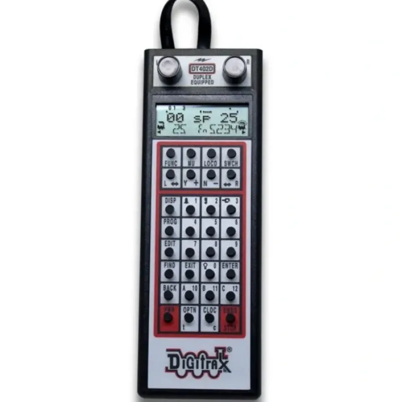 This is a Digitrax DT402D Duplex LocoNEt Super Throttle Control. This features keypad controls functions 0-28, MU operations, programming, editing and more. Please see my pictures for additional features.