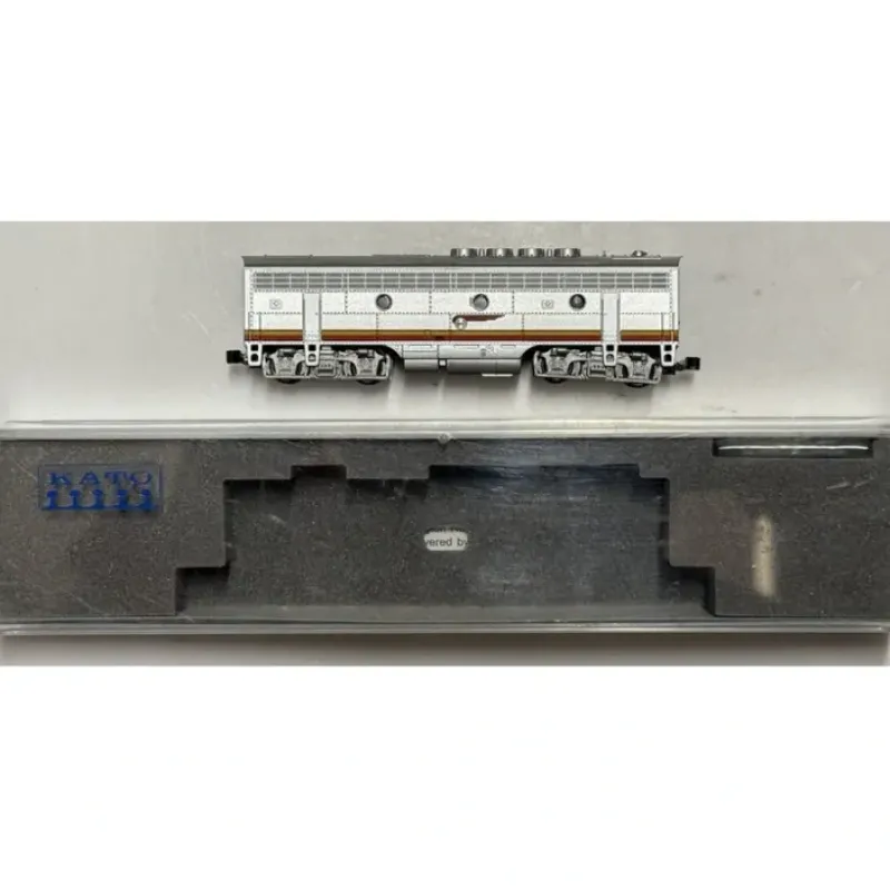 This is Kato 176-1122 N F3B/Late SF Warbonnet. EMD F3B Late Type Santa Fe Warbonnet. Being long lived units, Santa Fes F3s were continuously being upgraded, with late era revisions having their distinctive chicken wire grills replaced by the stainless steel grills that EMD was fitting on their newer F7 productions. These F3s ended up looking remarkably similar to their later built F7 cousins, though they still retained their early style roof fans.
