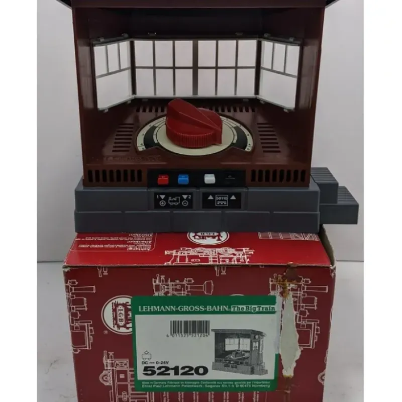 Here is an LGB 52120 Indoor/Outdoor Loco Controller. This controller is housed inside a control office to make hiding it on your layout easier. Features include plastic construction and a throttle control knob.