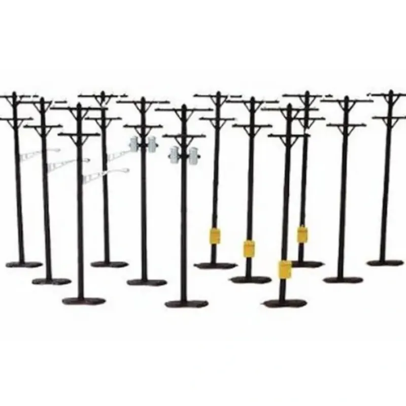 Long lines of poles carrying electrical, telephone and other wires often stretch for miles alongside the tracks. This set of appropriately colored and detailed utility poles will look great on your railroad. Molded plastic. 12 pieces