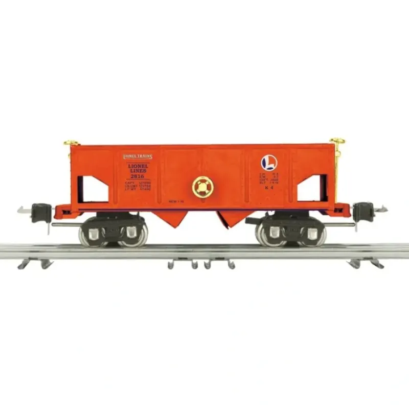 Here is an Lionel 11-70044 O Gauge Lionel Lines Orange Tinplate Hopper Car #2816. Features include a stamped steel body and chassis, baked enamel finish, automatic box couplers, nickel trim, stamped metal trucks with journal boxes and metal wheels and axles.