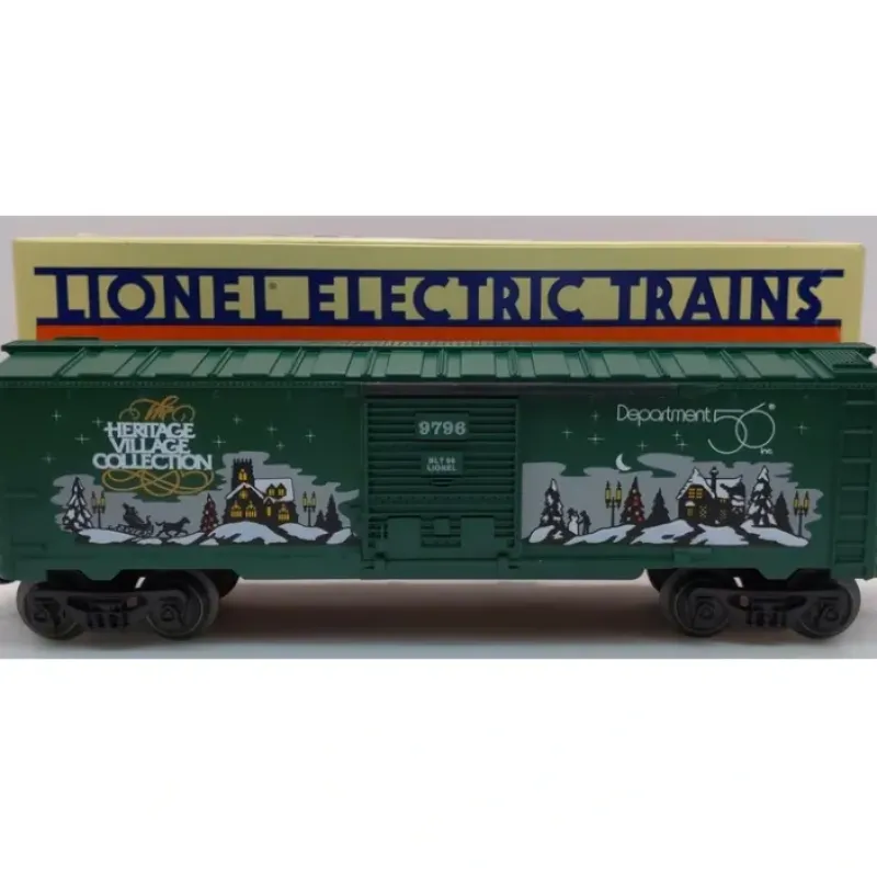 This is the Lionel 6-16270 O Gauge Department 56 Heritage Village Boxcar #9796. It was a limited edition, uncataloged car, made in 1997. It features special winter scenes on each side. This car features plastic trucks, operating knuckle couplers, and metal wheels and axles.