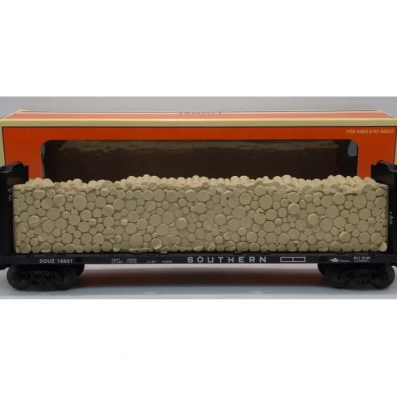 Here is a Lionel 6-16951 O Gauge 9823 Southern Bulkhead Flat Car w/ Simulated Wood Load. This flatcar features a removeable wood load, die-cast metal sprung trucks, die-cast metal operating knuckle couplers, metal wheels and axles.