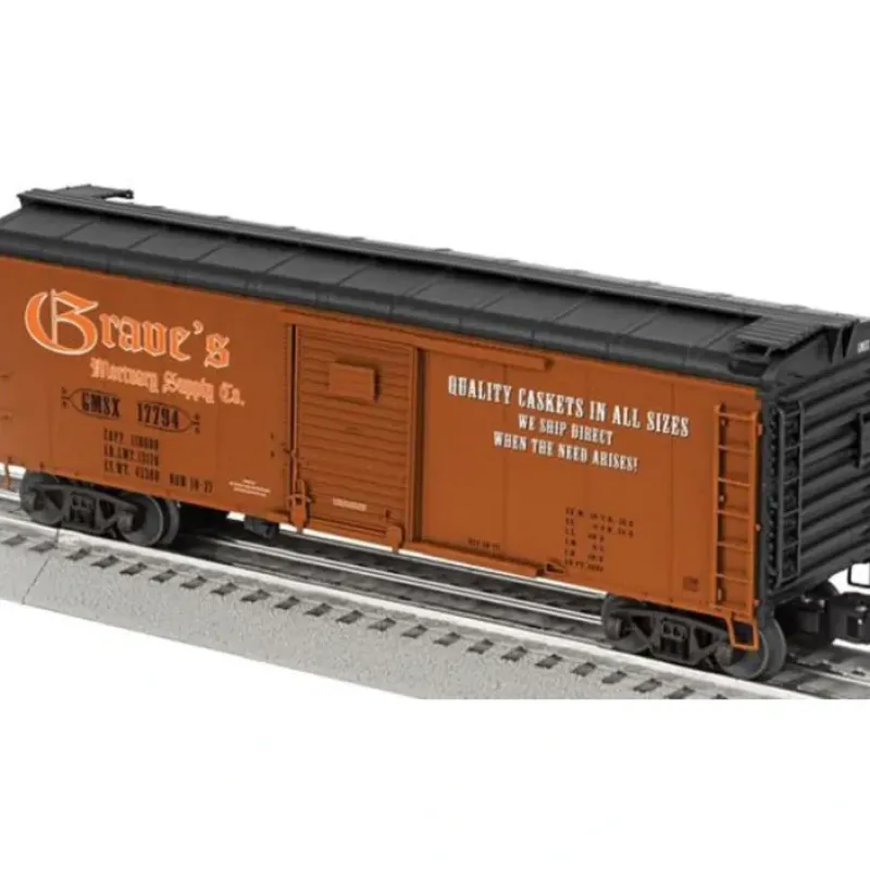 This is Lionel 6-17768 Boxcar Round Roof Grave’s. Grave Mortuary Supple Co. round-roof boxcar. Round-roof boxcar. In the early 1930s, Pennsylvania developed a new round roof style of boxcar that allowed for a taller 10 inner height and increased overall