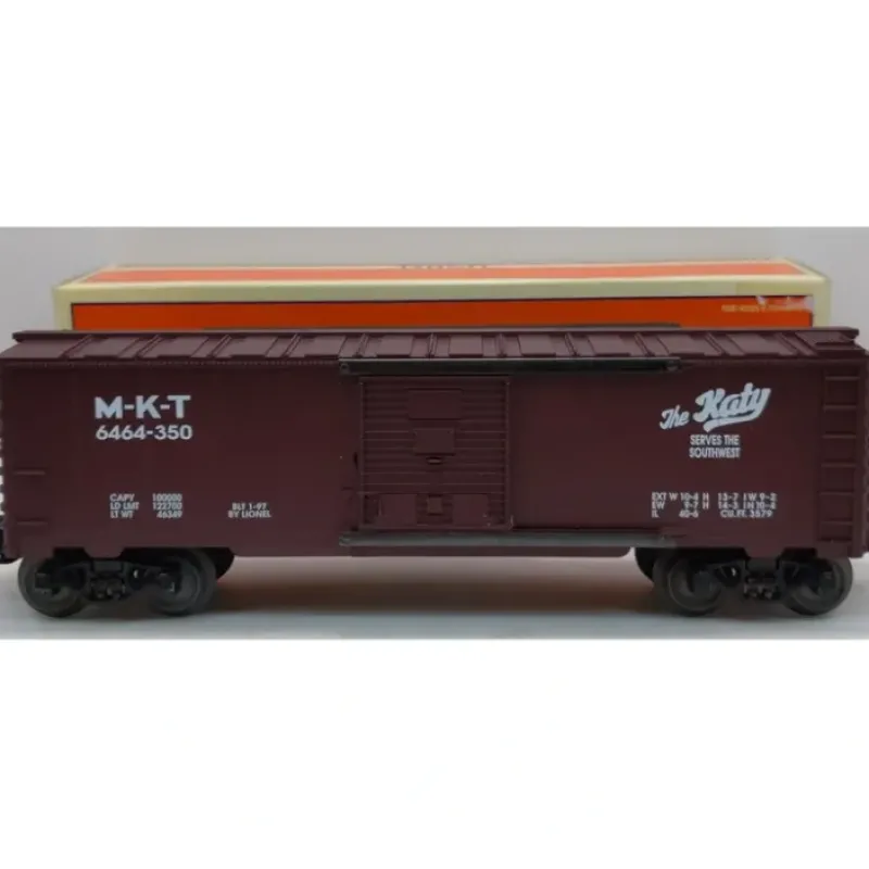 Here is aLionel 6-19293 O Gauge Missouri-Kansas-Texas 6464 Boxcar #350. This car is from the 6464 Boxcar Series 6 Set. It features sliding doors, die cast sprung trucks, and operating knuckle couplers.