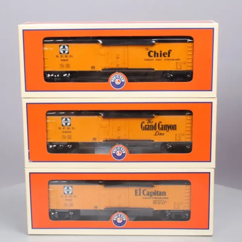 This is a Lionel 6-25934 O SF Map & Slogan Reefer (Set of 3). Santa Fe reefer 3-pack. A great add-on to any Santa Fe set. These reefers feature a slogan on one side and a map on the other. Each car has its own unique Santa Fe slogan!
