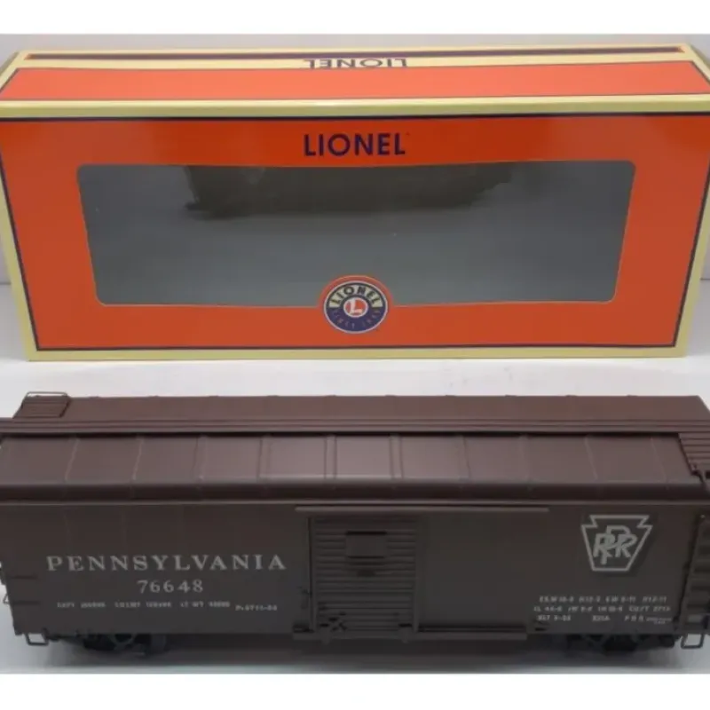 Here is a Lionel 6-38393 O Gauge PRR Single Door Round Roof Boxcar #76648. This car features die-cast metal sprung trucks, operating knuckle couplers, metal wheels and axles.
