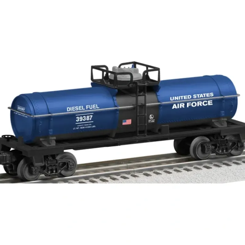 This is Lionel 6-39387 O USA/USAF Tank Car. U.S. Air Force made in USA tank car. Armed Forces Collection. Lionel honors the men and women of the U.S. Armed Forces! For each branch of the service, a specially decorated boxcar, flatcar, and tankcar are available. The single-dome tankcar and flatcar with load join the US made rolling stock roster!