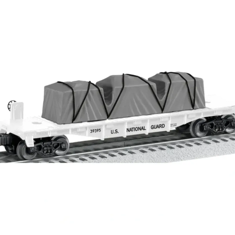 This is Lionel 6-39395 O USA National Guard Flatcar w/Tarped Load from the Armed Forces Collection. Lionel honors the men and women of the U.S. Armed Forces! For each branch of the service, a specially decorated boxcar, flatcar, and tankcar are available. The single-dome tankcar and flatcar with load join the US made rolling stock roster!