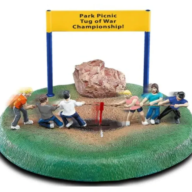 At the Lionelville town picnic, everyone enjoys a little friendly competition. The tug-of-war game is in full swing. Which side will win? Connects easily to FasTrack with a Plug-n-Play Lock-on (sold separately). Connects to a traditional O/ O27 track lock-on or to an accessory power supply (lock-on and power supply sold separately; AC and DC compatible; Features a hidden switch on accessory that activates the unit FeaturesThree animated figures on each side pull the rope back and forth; Includes separate switch box for On/Off control, Mounting tabs to secure accessory to layout to Traditional O Gauge