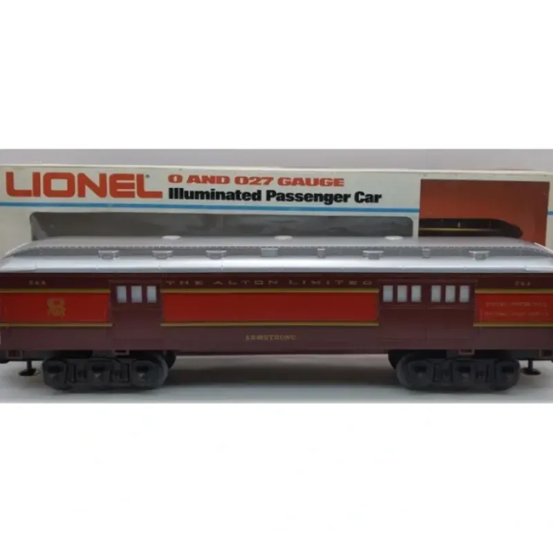 Here is a Lionel 6-9554 O Gauge Chicago & Alton “Armstrong” Baggage Car from 1980. This car was part of the Alton Limited Red Train from that period. This car has an illuminated interior, translucent window strips, die-cast 6-wheel metal trucks, die-cast metal operating knuckle couplers, and metal wheels and axles, and is 12 inches long.