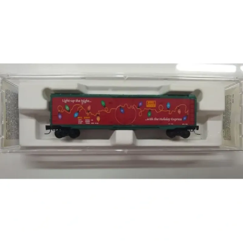 Here is a Micro-Trains 13621-2 Z Scale MTL Holiday 50′ Standard Plug Door Boxcar #2000. These cars feature plastic construction, plastic trucks, knuckle couplers, and plastic wheels and axles.