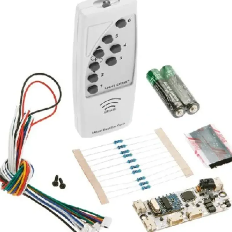 This is an MRC 025000 Light Genie Transmitter/Receiver. Light Genie is a wireless system with a 2.4Ghz transmitter and 5 Zones (12 outputs) receiver. Each output can control 2 incandescent bulbs or 4 or more LEDs. With a total of 12 outputs, Light Genie can control an average of 24 light bulbs or 48 or more LEDs. The Genie receiver is broken down into 5 zones. Each zone can independently turn on lights, as well as dim or brighten them. Each zone offers more than 20 different lighting effects including sequential flashing, strobe lighting, fast flicker to produce a fire effect, double strobe, random flash and many others. You can hook up a three bulb traffic light to a zone and another zone can operate a perpendicular traffic light that will automatically cycle in the opposite direction so they can control a 4 way corner. Each Genie offers a 90-foot operating range, works flawlessly in tunnels and penetrates walls without loss of signal. What’s more, multiple Genies can be used without any worries of cross interference. DCC Operation, Light Genie will operate like most standard NMRA decoders, but without speed control functions. The decoder can be controlled using the many of the function buttons on your DCC controller., Light Genie like most DCC decoders, is preset with a default address of #3. Light Genie uses short addressing (1-127). Programming can be done on the program track and/or main track. Once you have given your Light Genie decoder an address, use the accessory function to turn on/off light, change lighting effects, change brightness/dimness, and light effect rate.