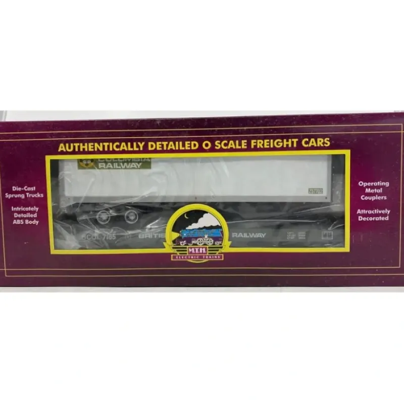 This is a MTH 20-95119 O BC Railway Flatcar w/ 40′ Trailer. Intricately Detailed Durable ABS Body, Metal Wheels and Axles, Die-Cast 4-Wheel Trucks, Operating Die-Cast Metal Couplers, Colorful, Attractive Paint Schemes, Fast-Angle Wheel Sets, Needle-Point Axles, 1:48 Scale Dimensions, (1) 40′ Trailer, O Scale Kadee Compatible Coupler Mounting Pads, Unit Measures:14 1/2 x 2 1/2 x 4 1/2, Operates On O-31 Curves.