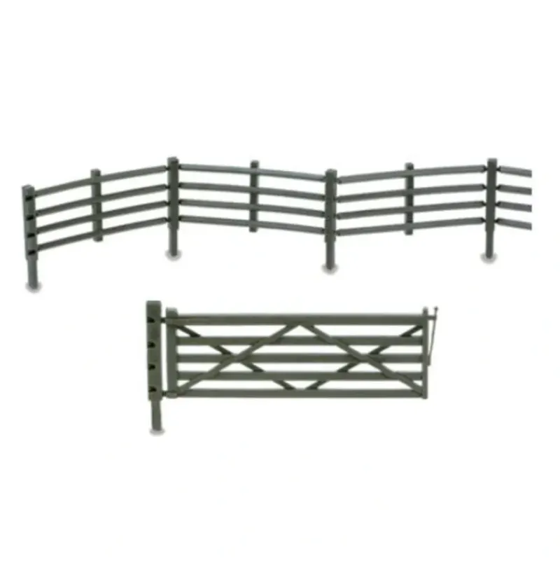 This is a Peco LK-743 O Flexible Field Fencing and Gates (4). Flexible field fencing. 7mm scale. This flexible fencing will follow the landscape contours in prototypical manner with the posts remaining vertical on any terrain. The brownish plastic mouldings have an authentic ”weathered” apperence. Each pack contains 47 inches of fencing and 4 gates. This pack replaces item numbers LK-745 & LK-746.