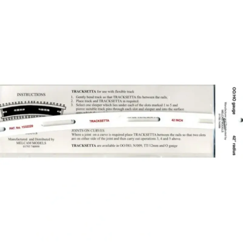 Coated steel template makes it easy to lay track with smooth curves and straight lines without dog-legs. Simply fit between the rails to hold the track in_position and pin track down through the slots. With Tracksetta, reverse and transition curves can be laid easily and accurately even when working alone. An invaluable aid.