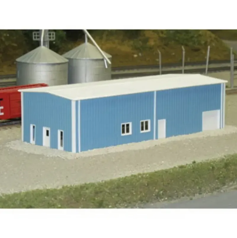 This is Rix 5418003 N Scale Prefab Warehouse Kit. Building shown 20 scale feet tall. This kit is designed with cut lines on the back side of the walls so that you can choose the height of the building. Walls are 24 scale feet high with cut lines to produce a 20,16,12, and 10 foot tall building. Side walls and End walls have door and window openings provided. Solid walls have cut lines for door and window openings (optional). Kit includes doors, windows and down spouts. Dimensions: 30 X 80 Scale Feet.