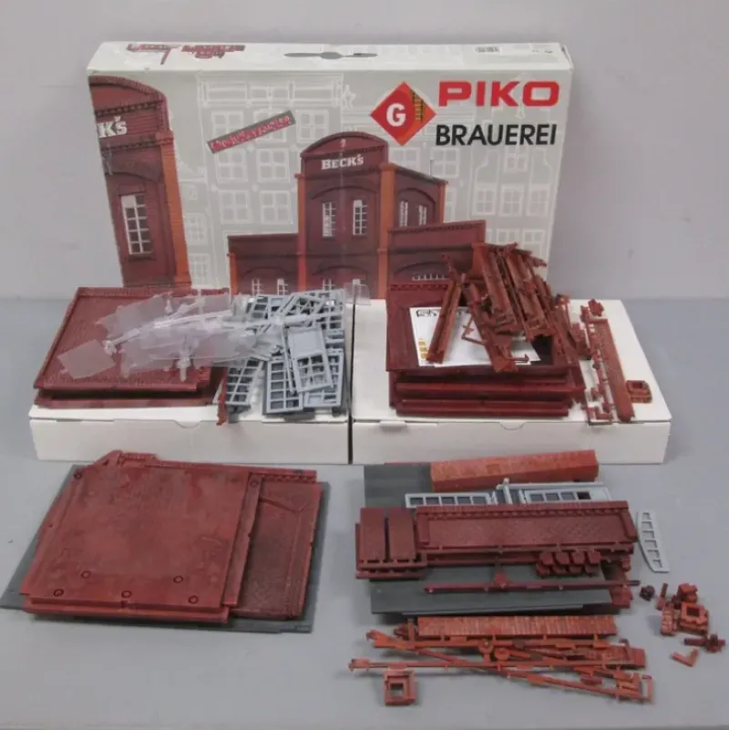 This is Piko 62014 G Scale Brewery. The kit allows the option of combining multiple kits to one another, but also in combination with the outbuildings to compile your personal brewery complex. The components are aged weatherproof and discreet. The doors of the main entrance can be opened and closed. Dimensions: 27.7 x 11 x 19.7″