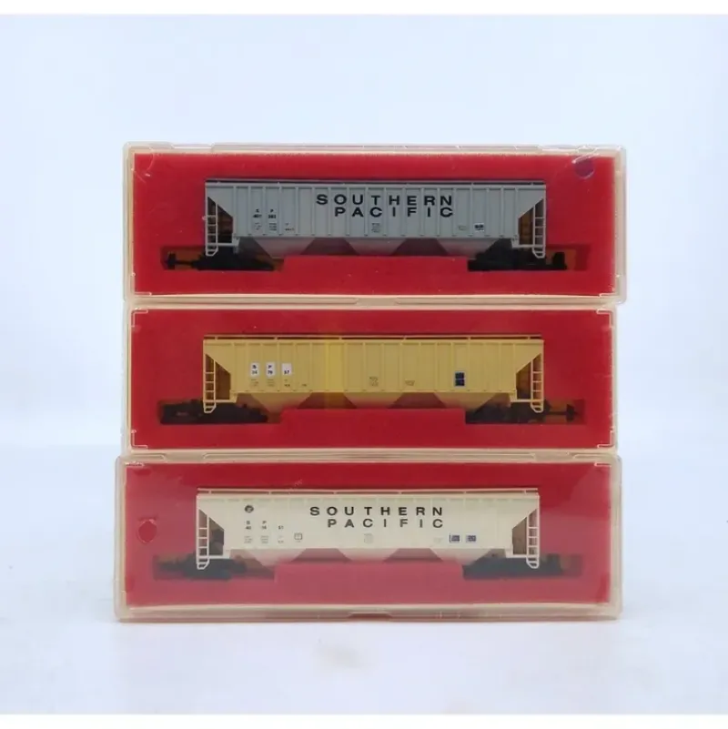 This is a Precision Masters 1404 N Southern Pacific Covered 3-Bay Hopper 3-Car Kit Set. These items display a plastic construction.