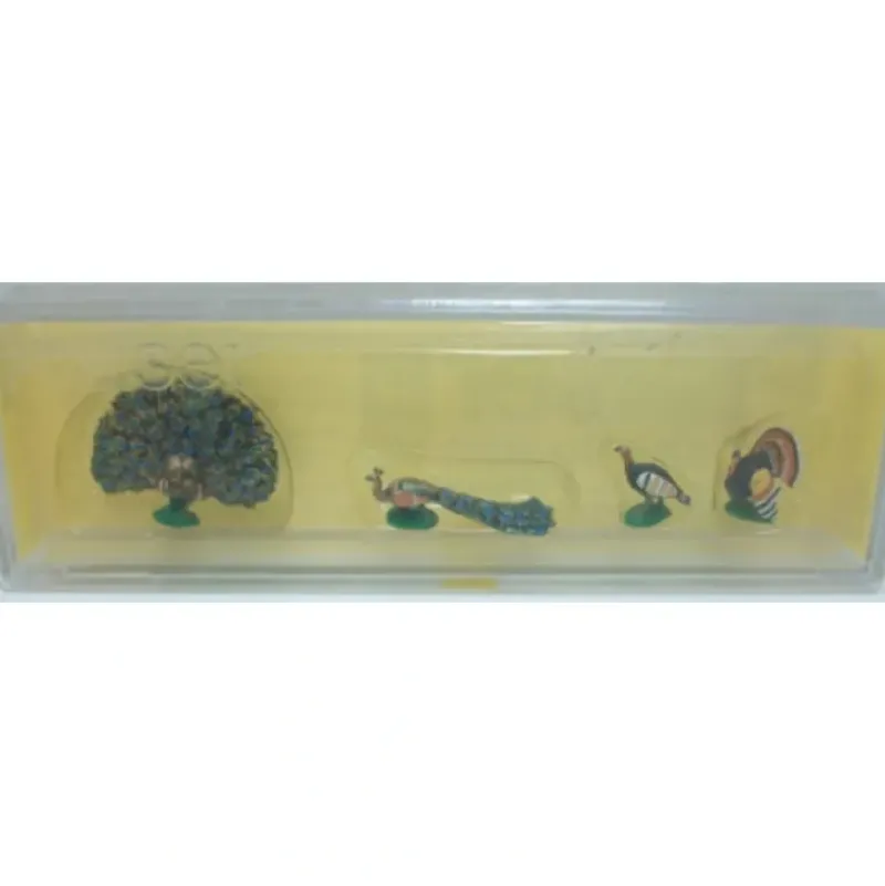 This is a Preiser 10166 HO Animals – Turkeys & Peacocks Figures (Set of 4). Preiser is the German Manufacturer of figures in HO, N, Z, G, and 1 Gauge. These incredible items are hand painted and come in a variety of designs and poses to cover a very wide range of needs on any project. Thare are no two items that are identical as they are hand painted. Some items, even when they have the same item number, may be painted in other colors. This makes it easier to have the same motif with more figures in different color schemes.