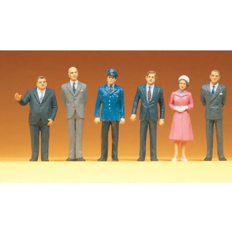 This is Preiser 68208 1:50 Scale People Standing. This set includes (4) men in business suits, (1) general in army suit, and a women in a pink dress. Pedestrians.