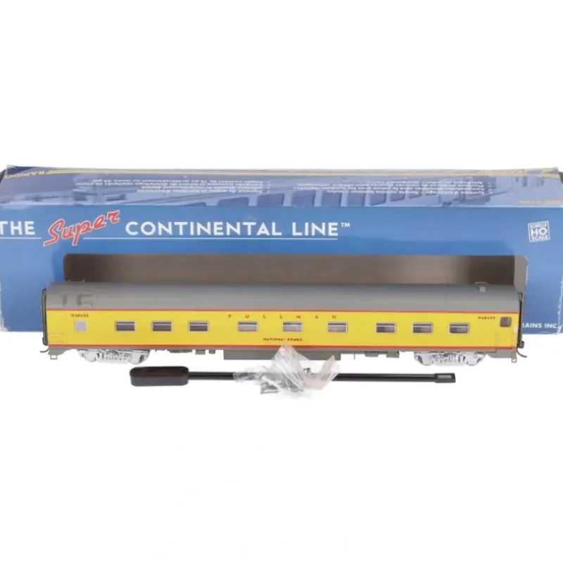 This is a Rapido Trains 113091 HO Scale Wabash National Homes Super Continental Line(TM) Post War 6-4-6 Sleeper – Ready to Run (UP City Scheme, Armour Yellow, gray).