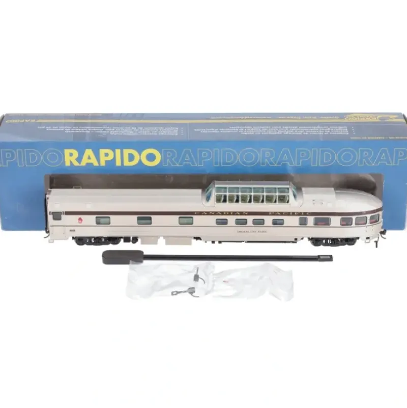 This is a Rapido Trains 120010 HO Scale Canadian Pacific Budd Park Series Dome-Lounge-Sleeper wih Fluted Sides Tremblant Park (silver, maroon). With unique names honoring famous Canadian national parks, these classic stainless steel Budd passenger cars have been bringing up the markers on premier CP (and later VIA) trains since 1954. Cars come fully decorated and assembled with factory-installed grab irons, realistic stainless steel finish and full underbody with air, steam and electrical lines. They have fully decorated interiors with track-powered, constant lighting and window blinds at different heights for each car. Each car is equipped with operating diaphragms with etched-metal end gates, magnetic metal knuckle couplers at the correct height, free-rolling trucks with metal wheelsets and illuminated marker lights and drumhead. Maroon cars include extra drumhead styles (such as The Dominion). VIA cars feature illuminated red light above the bullet lounge. Unnamed cars include all of the different name board lengths and the car name decals. 22 minimum radius (can be modified for 18 minimum)