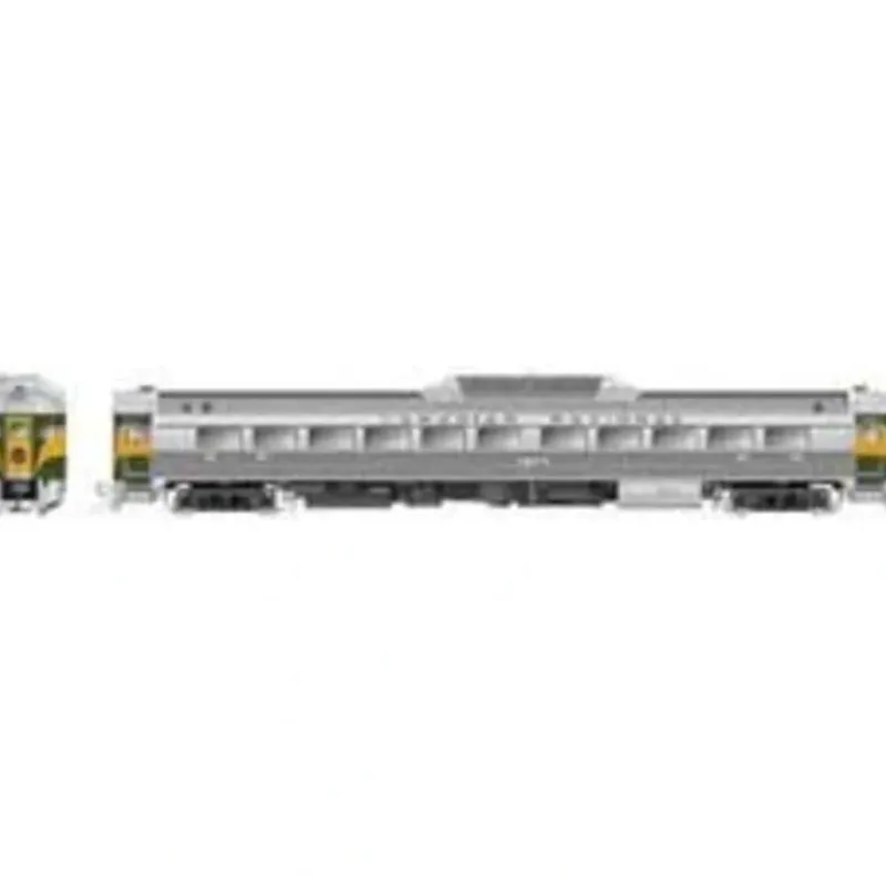 This is a Rapido Trains 16011 HO Scale Canadian National Budd RDC-1 Phase 2 – Standard DC No Number (As-Delivered, Stainless Steel, green, yellow).