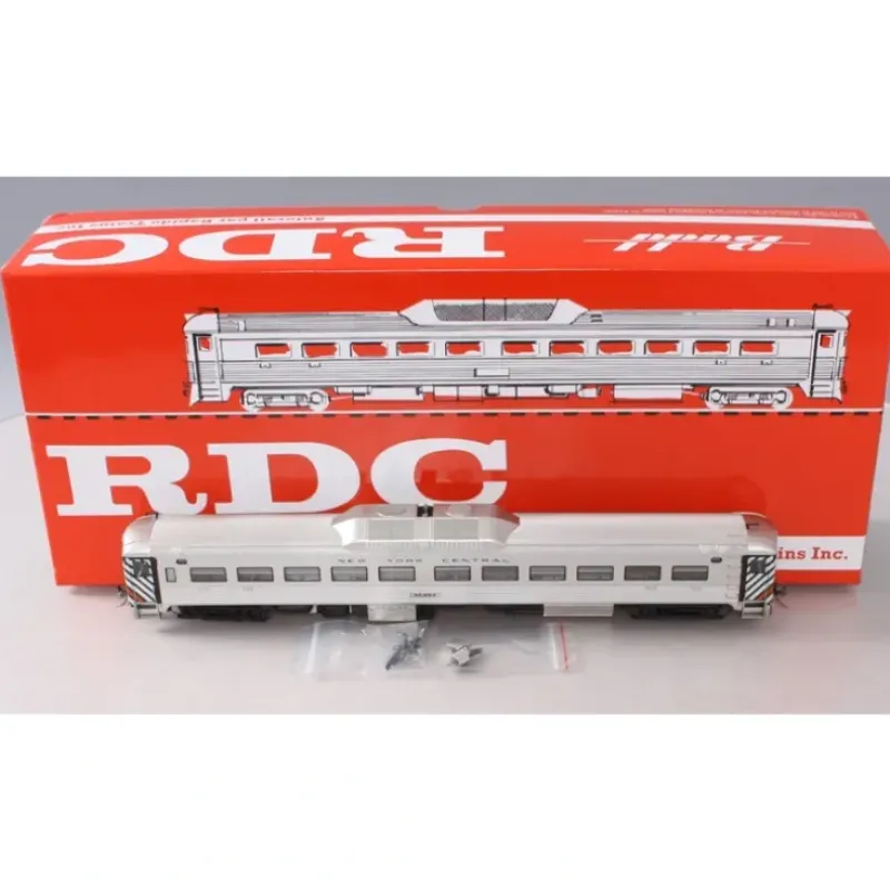 This is a Rapido Trains 16574 HO Scale New York Central Budd RDC-1 Phase 1B with Sound & DCC #M454 (Stainless Steel, black, white, orange). This item displays a plastic construction, knuckle couplers, plastic trucks, metal wheels and axles.