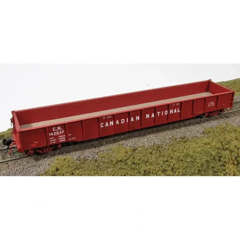 This is a Rapido Trains 50010 HO Scale Canadian National 52′ 6 Canadian Mill Gondola – Ready to Run (Various Roadnumbers; Boxcar Red, 12 Lettering). Features ends that drop down nice and flush, rivets on the sides of the posts, full underbody detail including bleed valves, full interior and die cast metal floor and rebuilt trucks on some later cars.