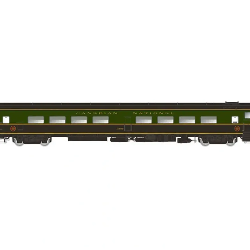 This is a Rapido Trains 503013 N Scale Canadian National Panorama Line(TM) Cafe-Bar-Lounge, No Skirting, Fixed Steps – Ready to Run #2514 (1954 Scheme, green, black).