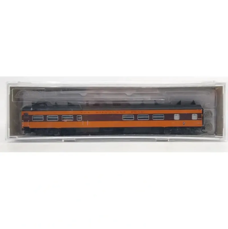 This is a Rapido Trains 503037 N Scale Milwaukee Road Panorama Line(TM) Cafe-Bar-Lounge, No Skirting, Fixed Steps – Ready to Run #165 (orange, maroon, black).