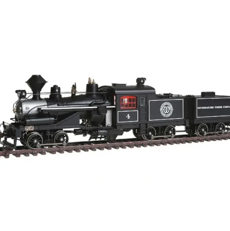 This is a Rivarossi HR2413 HO Weyerhaeuser Timber 3-Truck Heisler Steam Locomotive #4. One of the famous American geared steam locomotives, the Heisler was also the fastest. It was designed in 1891 and patented in 1892 by Charles L. Heisler. 850 were built, the last delivered in 1945. The model is fully assembled with a metal die cast chassis, flywheels, knuckle couplers, directional front and rear lights and RP-25 wheelsets.
