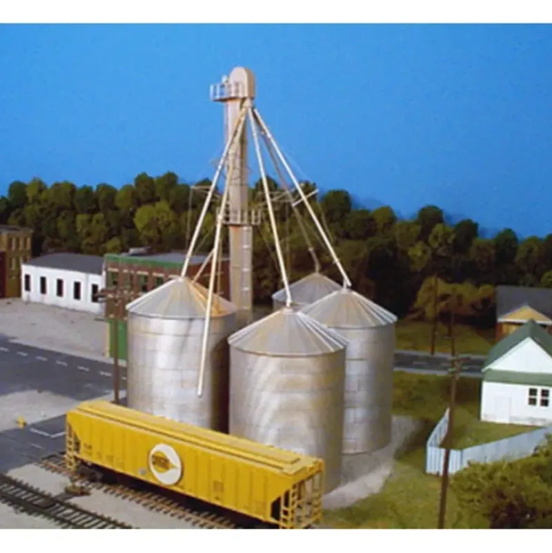 This is a Rix Products 628-0407 HO Scale 4 Silo 90′ Grain Elevator Kit.