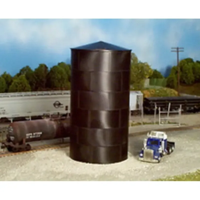 The Rix Water and Oil Tank is designed to represent riveted steel tanks which the railroads started building back in 1880 during the steam era. Today tanks similar to these are being used to hold oil and chemicals. The Rix Water and Oil Tank is made up of 6 band segments which form a complete band. The bands are then stacked one on top of another until they reach the given height. Kit makes 1 43′ tall by 24′ diameter riveted, steel tank with peaked top. All tanks are molded in a black polystyrene.