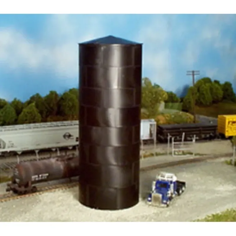 The Rix Water and Oil Tank is designed to represent riveted steel tanks which the railroads started building back in 1880 during the steam era. Today tanks similar to these are being used to hold oil and chemicals. The Rix Water and Oil Tank is made up of 6 band segments which form a complete band. The bands are then stacked one on top of another until they reach the given height. Kit makes 1 60′ tall by 24′ diameter riveted, steel tank with peaked top. All tanks are molded in a black polystyrene.