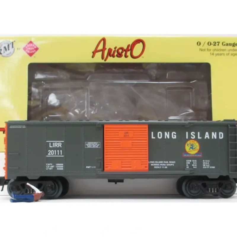 Here is a RMT 96411B O Gauge Long Island Railroad Boxcar #201111. This car features die-cast metal sprung trucks, operating knuckle couplers, sliding side doors, metal 3-rail wheels and axles.