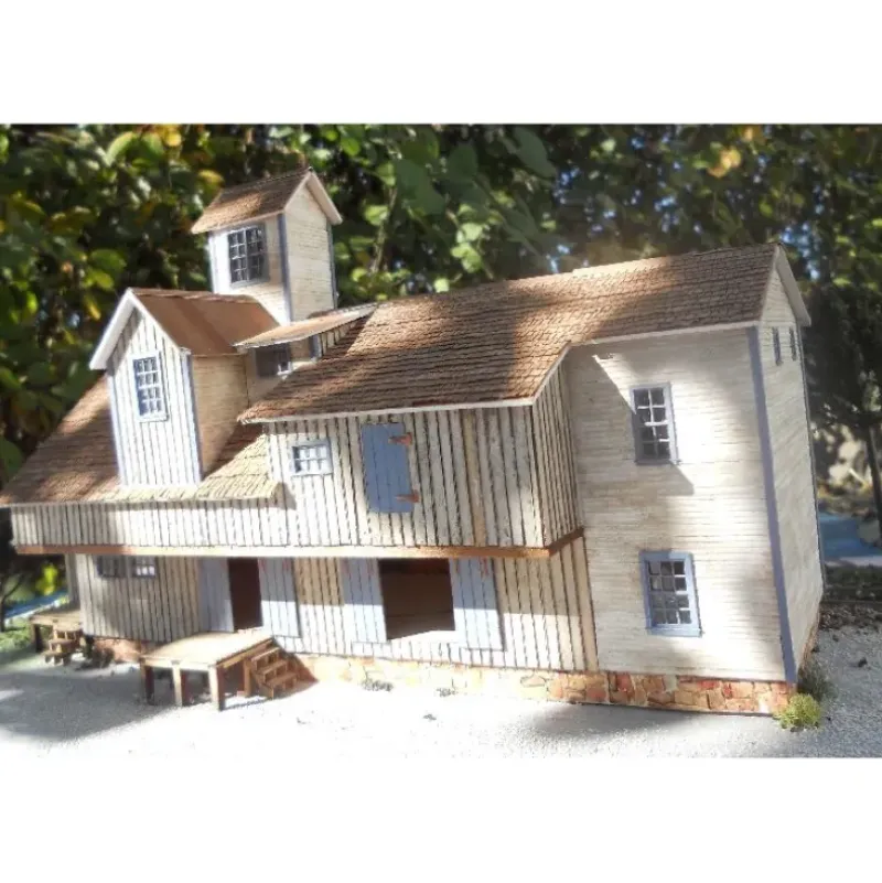 This is a RS Laser Kits 2041 HO Keystone Mill. The original Keystone Mill was built in the late 1900s and still stands today as a lumber yard in Pennsylvania. Each kit features a foundation cast by Downtown Deco, board-on-board laser-cut siding, and Northeastern lap siding. This kit is limited to a run of 200 so reserve yours today. Footprint 12 inches by 5 inches.