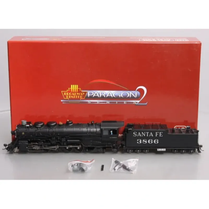 This is a Broadway Limited 2196 HO Scale Santa Fe 2-10-2 Steam Locomotive and Tender – Sound & DCC – Paragon2 #3866 (Modernized Version).Baldwin’s 3800 Class 2-10-2s were the largest on the railroad. The late 1940s to 50s modernized version engines are distinguished by the modified cab, raised running boards, drifting valve gear and LFM disc main driver. These models feature modernized version detailing, plastic loco and tender bodies with die cast chassis, precision drive mechanism, 5-pole can motor with skew-wound armature, integral DCC decoder with back EMF, variable Puffing Smoke and Paragon2 Sound and control system.