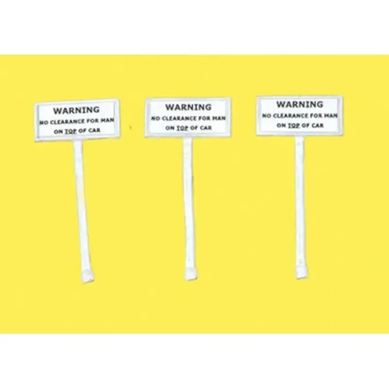 This is a JL Innovative Design 361-850 HO Scale Custom Railroad Right-of-Way Signs No Clearance Man on Top of Car pkg(3)