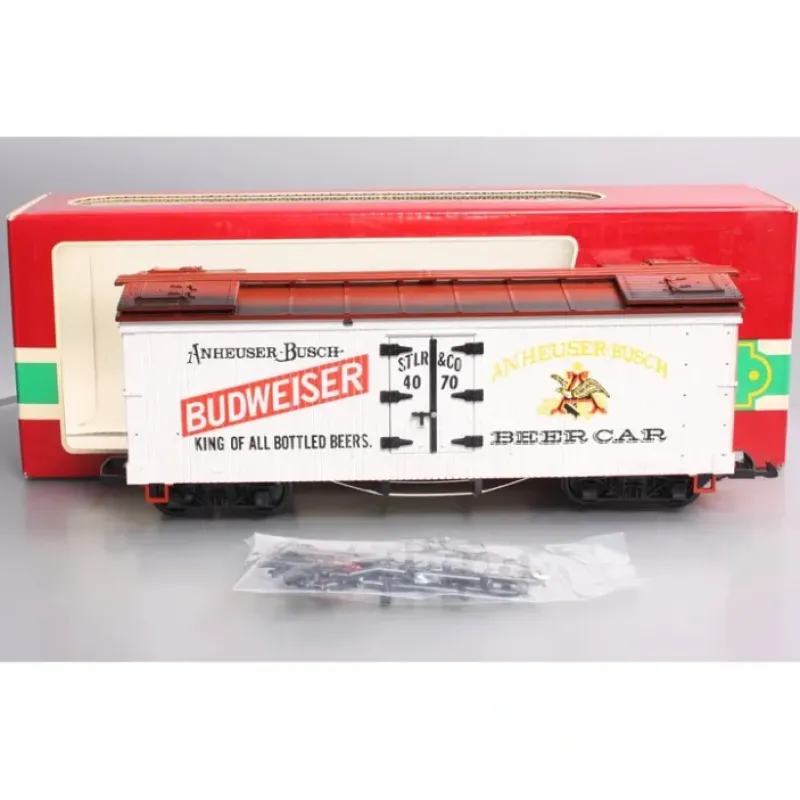 Here is a LGB 4070 G Scale Budweiser Woodside Reefer Car #4070. Features include durable plastic construction, opening doors with latches, latch couplers, underframe detail, plastic trucks and plastic wheels and axles. It measures 15 inches long.