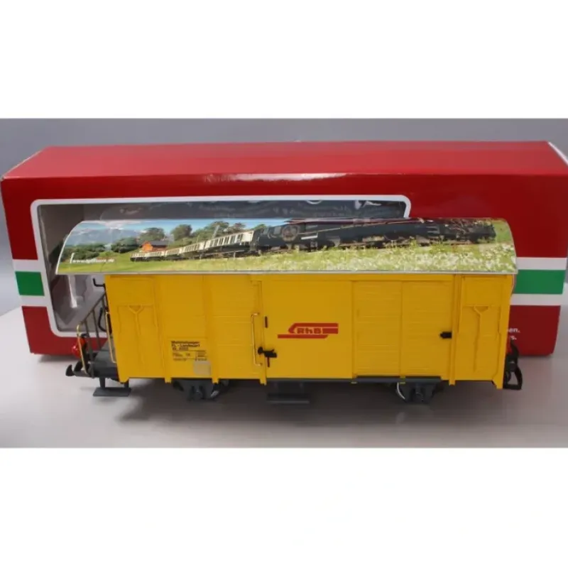 This is a LGB 40816 G Scale Type Xk Maintenance-of-Way Boxcar – Ready to Run Rhaetian Railroad RhB (Era V; yellow, silver, red). Freight cars no longer needed for regular service are sometimes rebuilt for maintenance service and serve as material cars. This is an authentic model with extensive paintwork and lettering. The paint scheme is correct on the frame and the handrails. The doors can be opened. The car has metal wheels.