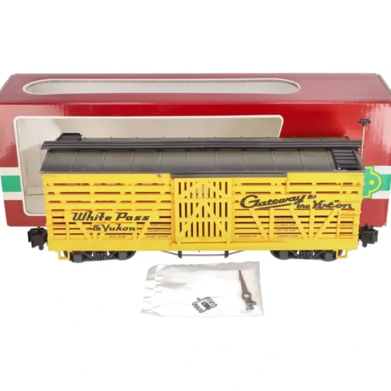 Here is a great LGB 4168 G Scale White Pass & Yukon Stock Car. It features plastic construction, sliding side doors, plastic trucks, plastic wheels, metal axles, and knuckle couplers.