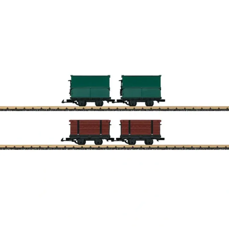 This is a LGB 426-49190 G Scale Light Railway 4-Car Set – Ready to Run 2 Each: Side Dump (green, gray) and High-Side Gondola (brown, gray). Features include plastic latch couplers, plastic trucks, and plastic wheels with metal axles.