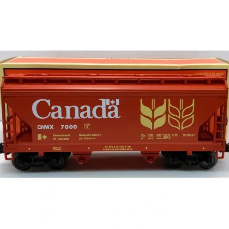Here is a Lionel 6-17010 O Gauge Canada ACF 2-Bay Covered Hopper Car #7000. This car is scale length and features die-cast metal sprung trucks, die-cast metal operating knuckle couplers, metal wheels and axles.