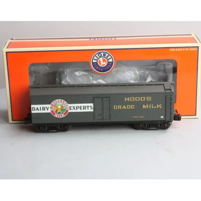 Here we have a Lionel 6-17350 O Gauge Hoods Milk Refrigerator Car #503. With their unsurpassed level of detail, the first four Lionel General American Milk Cars are already destined to become O gauge classics. These scale-sized cars are now available in four new liveries. Built in the early 1900s, these cars contained twin glass-lined tanks to keep milk cool at about 38 degrees Fahrenheit. Many of these specialized cars saw service through the late 1950s. They frequently ran in passenger trains in order to get the perishable cargo to its destination in the shortest amount of time. The Lionel Milk Cars ride on sprung die-cast metal passenger car trucks and also include sprung buffers just like the prototype. Each car includes a removable roof that reveals two plated milk tanks inside.