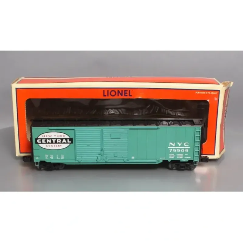 Here we have a Lionel 6-27203 O Gauge New York Central Double Door Boxcar #75509. This scale-sized car features auto frame load, 4 opening doors, hidden uncoupling tabs, separately applied metal underframe details, die-cast metal sprung trucks, die-cast metal operating knuckle couplers, and metal wheels and axles.