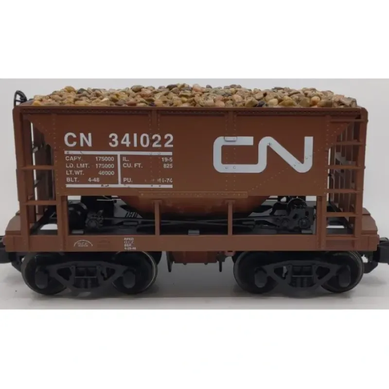 Here is a Lionel G Scale Canadian National Single Bay Hopper Car #341022 – Custom Load. It features plastic construction, knuckle couplers, metal wheels and axles.