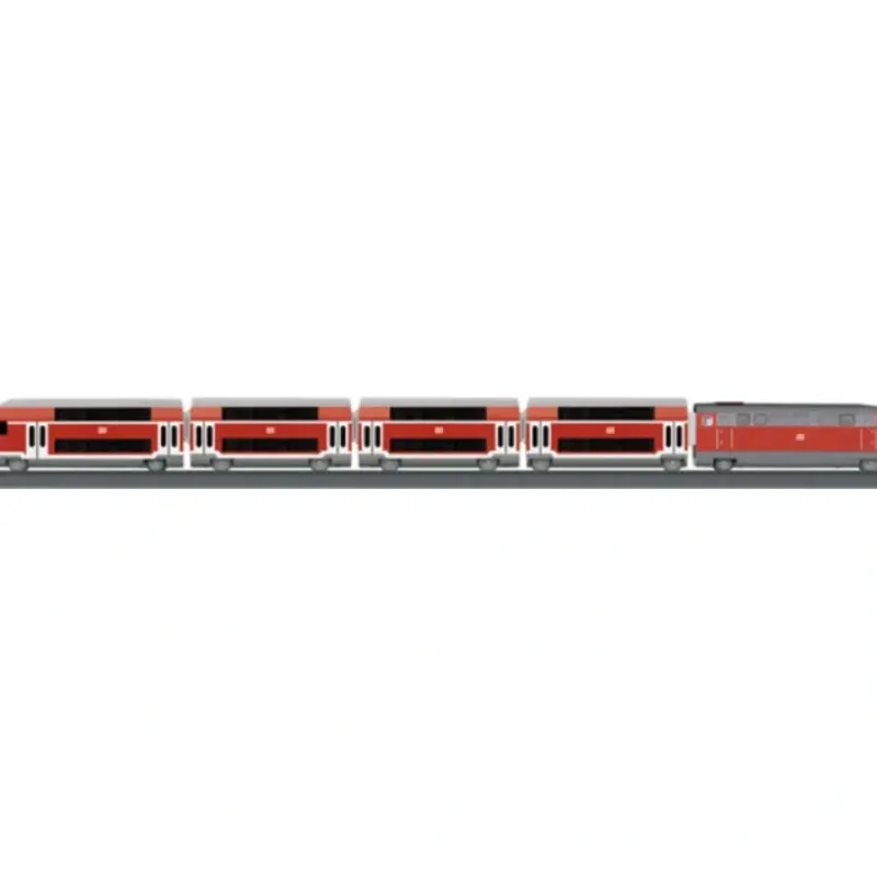 This is a Marklin 29209 HO Scale Regional Express Battery Operated Starter Set w/Plastic Track – My World German Federal Railroad DB Lights, sound, action. This set is fun for everyone. The five-part train set includes a permanently coupled motorized diesel locomotive attached to a bi-level passenger car with built-in battery holder. The train has three speed levels in both forward and reverse plus three sound functions and triple headlights. Magnet couplers, a sturdy plastic track layout and an infrared controller make it easy to set up and run. Batteries are included.